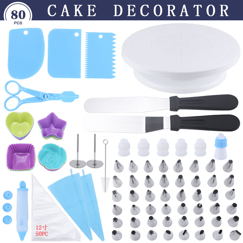 Amazon hot selling 80 piece cake turntable decoration piping nozzle set piping table sugar flipping baking tool