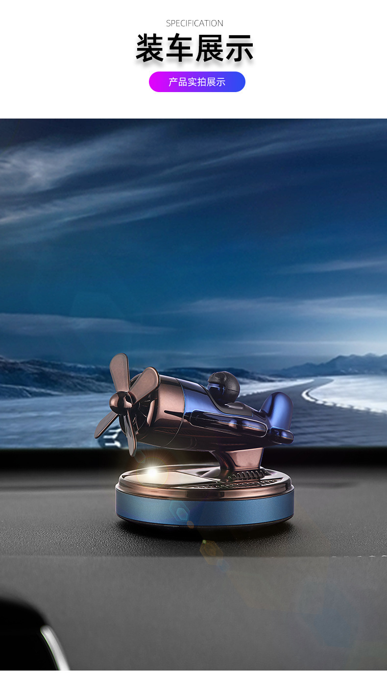 Car mounted solar powered airplane ornaments, high-end rotating center console, long-lasting light fragrance, car aromatherapy, odor removal decoration