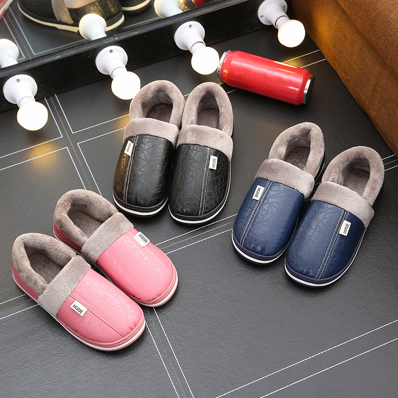 Cotton slippers for women in winter, new style with warm and non slip heel bags, postpartum shoes for home couples, PU leather waterproof thick soled cotton shoes for men