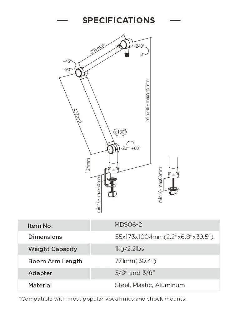 | Boom Arm Length | 771mm (30.4") | Boom Tube Diameter | 38.4X23mm |