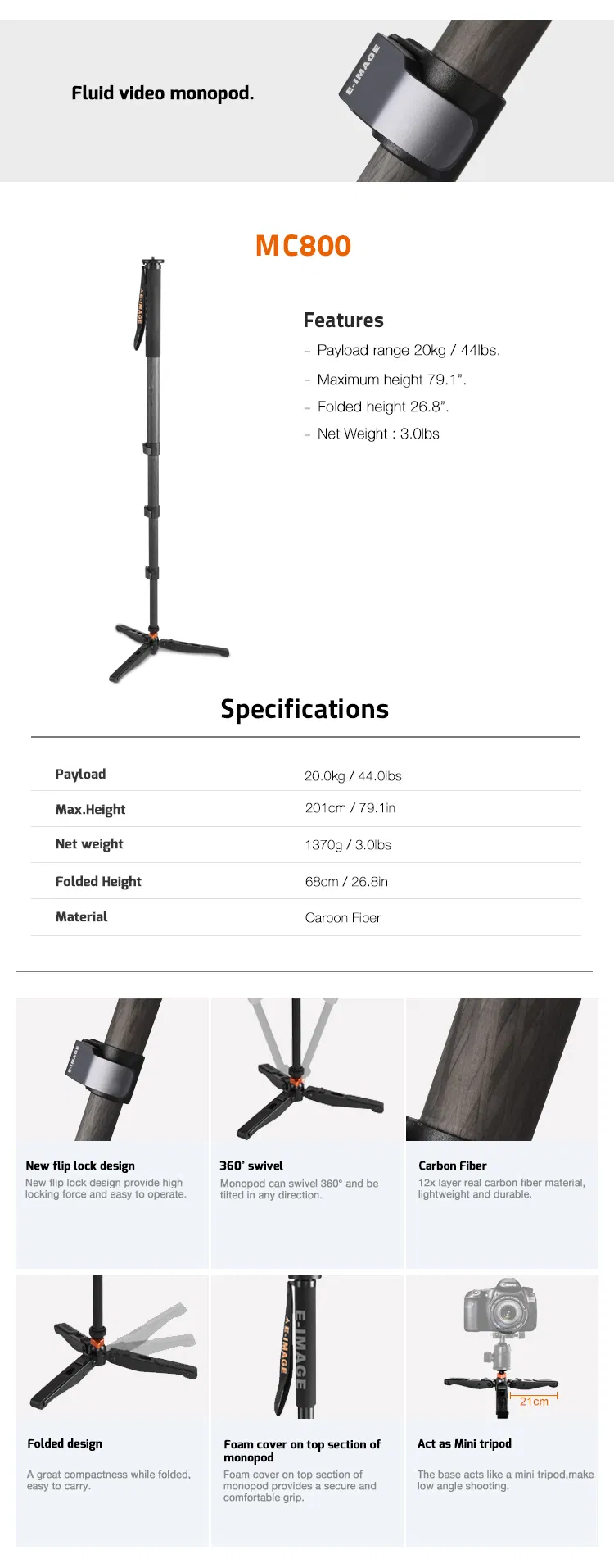 E-Image Heavy Duty Monopod for Camcorder (MC800+630FH)