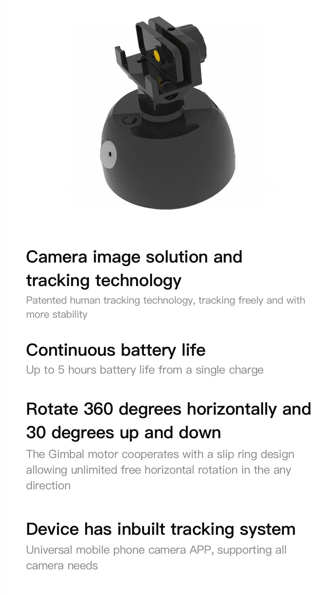 | Feature | Portable, Flexible, 360 Ai Tracking Rotation | Charger | USB Charging Type C 5V1a |