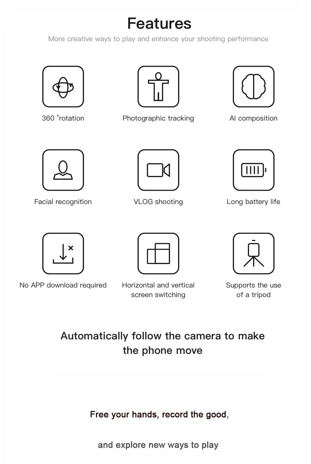 | Product Name | 360 Smart Shooting Gimbal | Suitable for | Cell Phone Size 40-100mm |